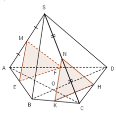 Tương tự, thiết diện của hình chóp khi cắt bởi mặt phẳng qua N và song song với mp(SBD) là tam giác NKH với NK // SB, NH // SD, KH // BD.
