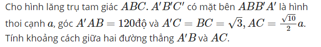 Cho hình lăng trụ tam giác ABC.A'B'C' có mặt bên ABB'B'là hình thoi cạnh a, góc A′AB=120độA′AB=120độ và A′C=BC=√3,AC=√102aA′C=BC=3,AC=102a. Tính khoảng cách giữa hai đường thẳng A′Bvà AC.
