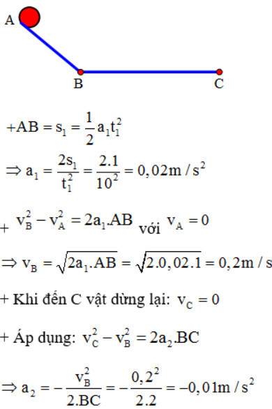 Quả cầu lăn từ đỉnh dốc dài 1 m sao 10 giây đến chân dốc sau đó quả cầu lăn trên mặt phẳng nằm ngang được 2 m thì dừng lại chiều dương là chiều chuyển động gia tốc của quả cầu trên dốc và trên mặt phẳng ngang lần lượt là