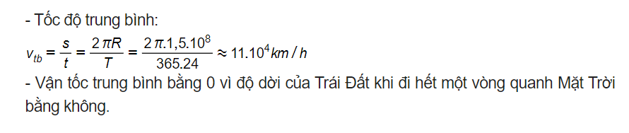 - Vận tốc trung bình bằng 0 vì độ dời của Trái Đất khi đi hết một vòng quanh Mặt Trời bằng không.