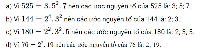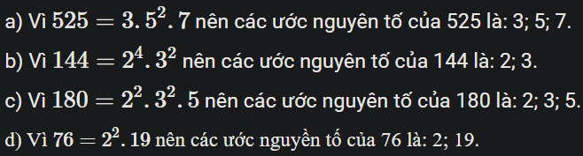 a) Vì 525=3.52.7525=3.52.7 nên các ước nguyên tố của 525 là: 3; 5; 7.