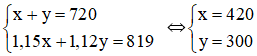 Gọi x (tấn) và y (tấn) lần lượt là số thóc mà hai đơn vị thu hoạch được trong năm ngoái (x, y > 0 và x < 720, y < 720)
