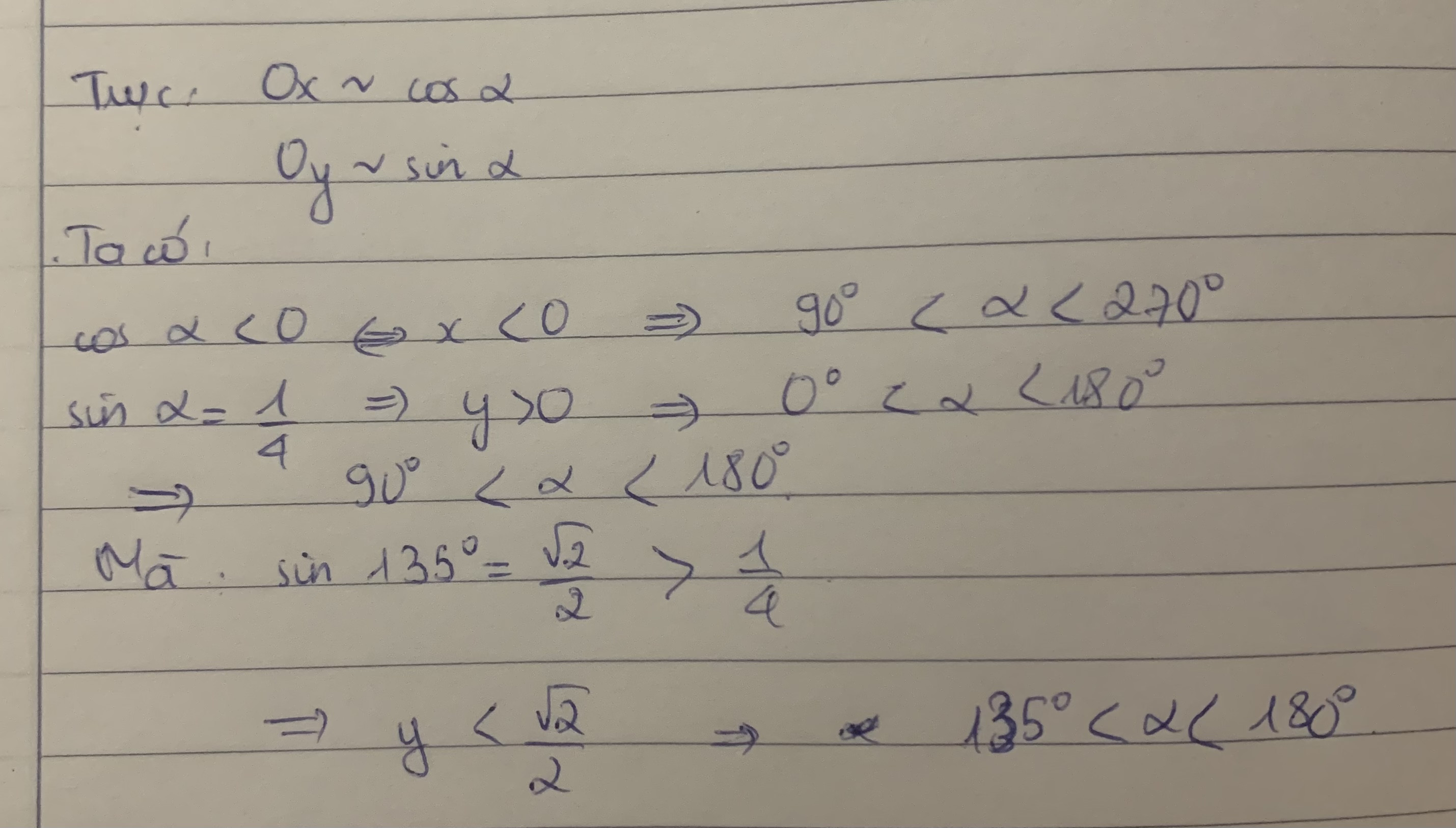 Cho góc $\alpha$ thỏa mãn $Sin \alpha=\dfrac{1}{4}$ và $cos\alpha<0.$ Số đo góc $\alpha$ thuộc khoảng nào sau đây? A) $(0^o, 45^o)$ B) $(45^o, 90^o)$ C) $(90^o, 135^o)$ D) $(135^o, 180^o)$ Giải thích kĩ vì sao lại chọn đáp án giúp mình ạ mình cảm ơn.