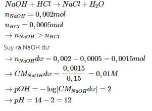 cho 100ml dung dịch NaOH 0.02M vào 50ml dung dịch HCl 0.01M sau phản ứng thu được dung dịch X . Xác định ph của dung dịch x