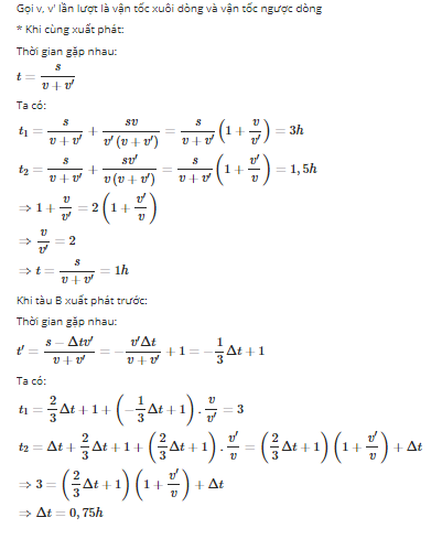Biết vận tốc của mỗi tàu đối với nước là như nhau và không đổi lúc đi cũng như lúc về. Khi xuôi dòng vận tốc dòng nc làm tàu chạy nhanh hơn khi ngược dòng.