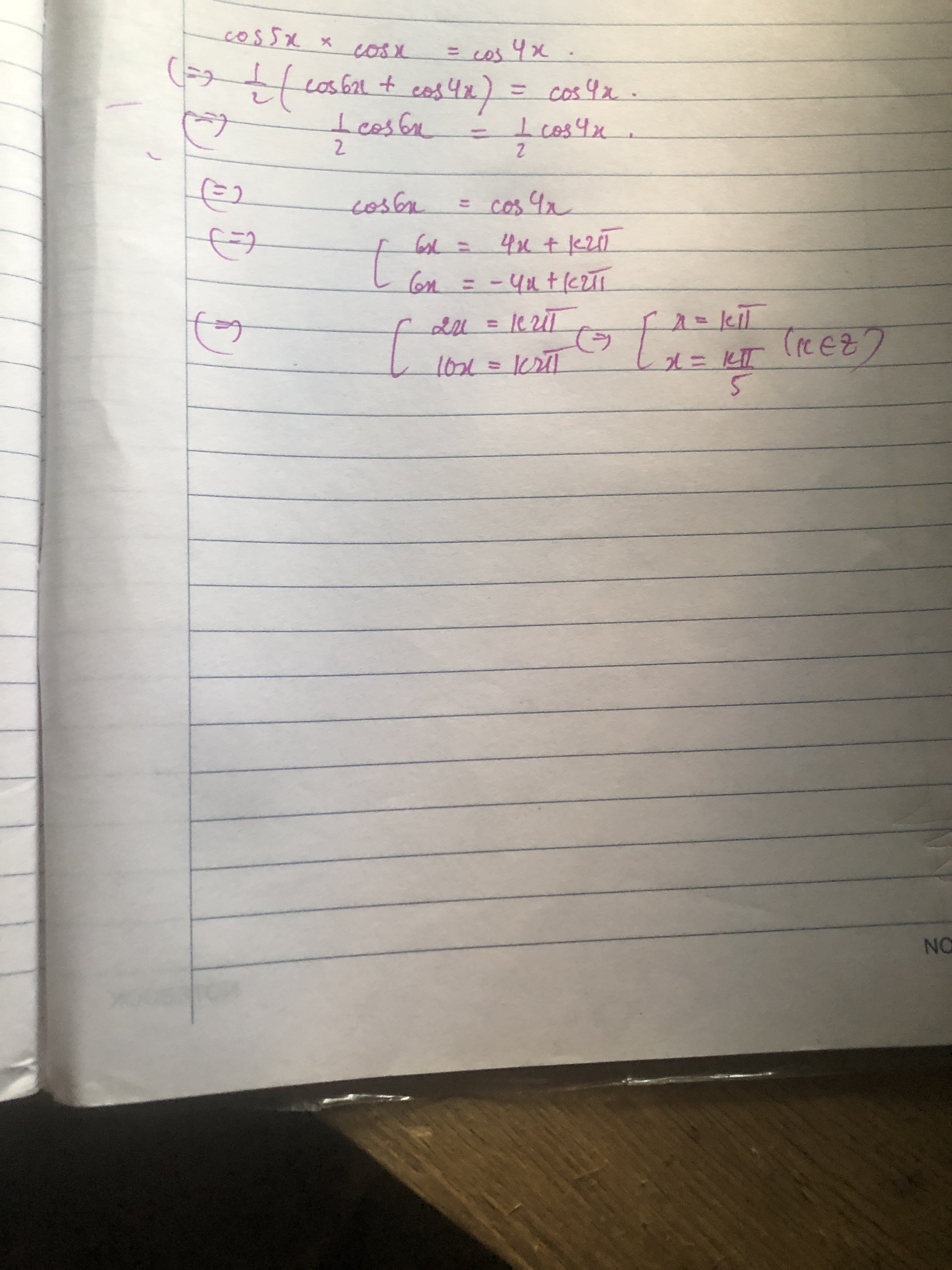 ⇔\(\left[ \begin{array}{l}6x=4x+k2\pi\\6x=-4x+k2\pi\end{array} \right.\)⇔ \(\left[ \begin{array}{l}2x=k2\pi\\10x=k2\pi\end{array} \right.\) ⇔\(\left[ \begin{array}{l}x=k\pi\\x=k\frac{\pi}{5}\end{array} \right.\) $(k∈Z)$