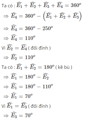 Bài 7: Hai đường thẳng AB và CD cắt nhau tại E tạo thành bốn góc không kể góc bẹt. Biết tổng của ba trong bốn góc này bằng 250° , tính số đo của bốn góc đó
