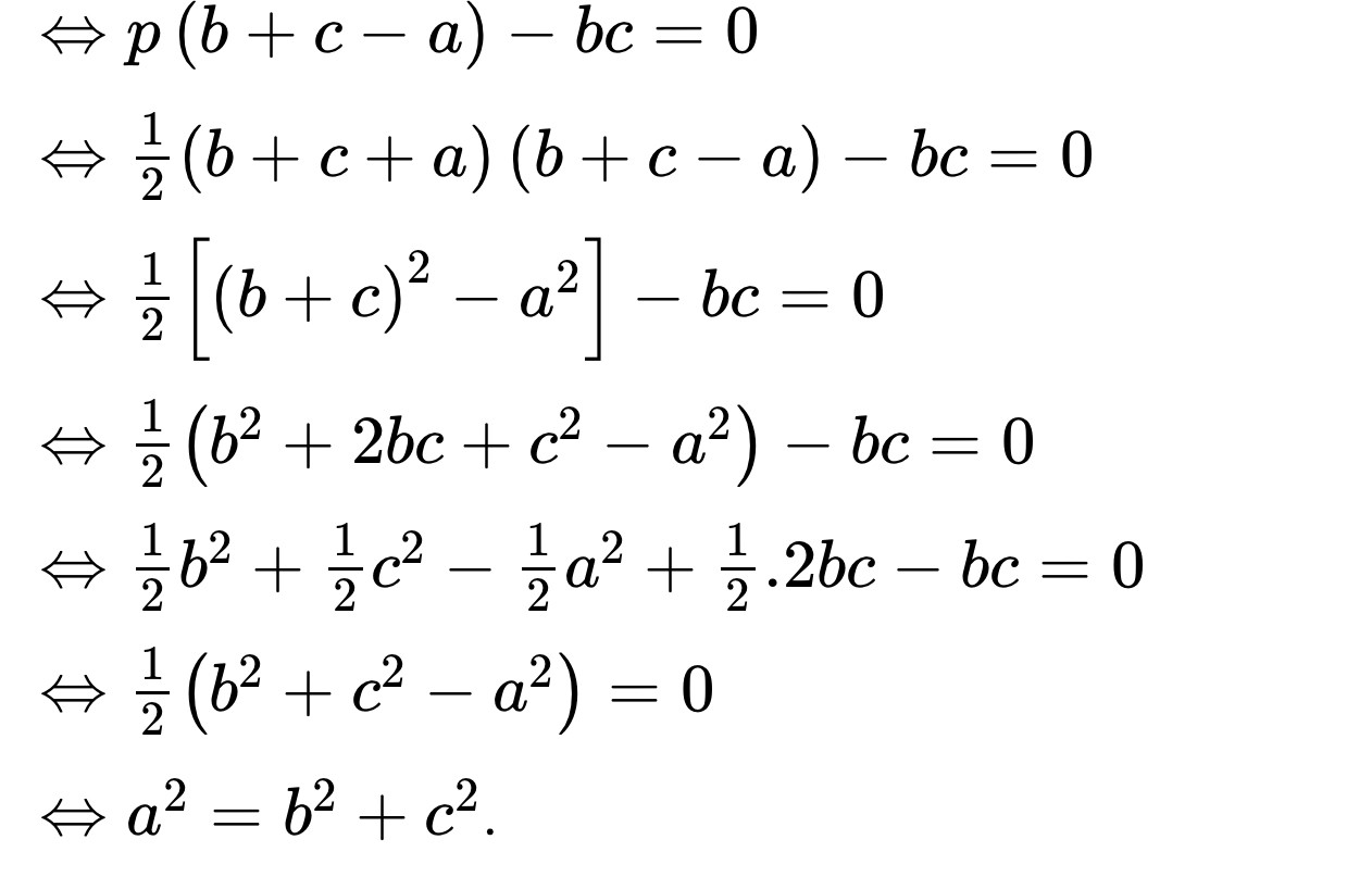 Sao 1/2(b²+c²-a²)=0 <=> a²= b²+c² vậy ạ