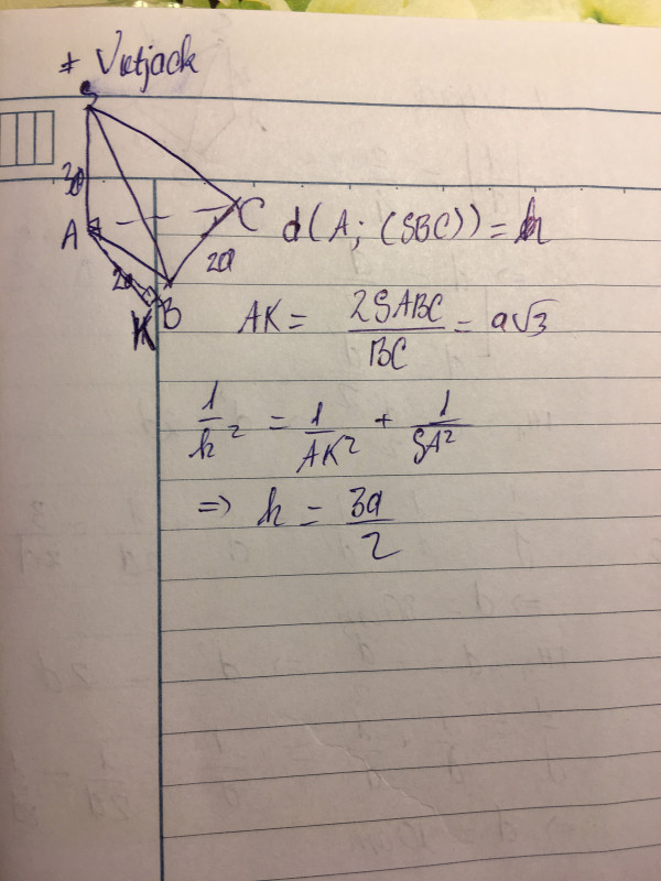 Cho hình chóp tam giác S.ABC có AB = BC = 2a và’ ABC = 120◦. Cạnh SA = 3a và vuông góc với mặt phẳng đáy. Tính khoảng cách d cách từ A đến mặt phẳng (SBC).