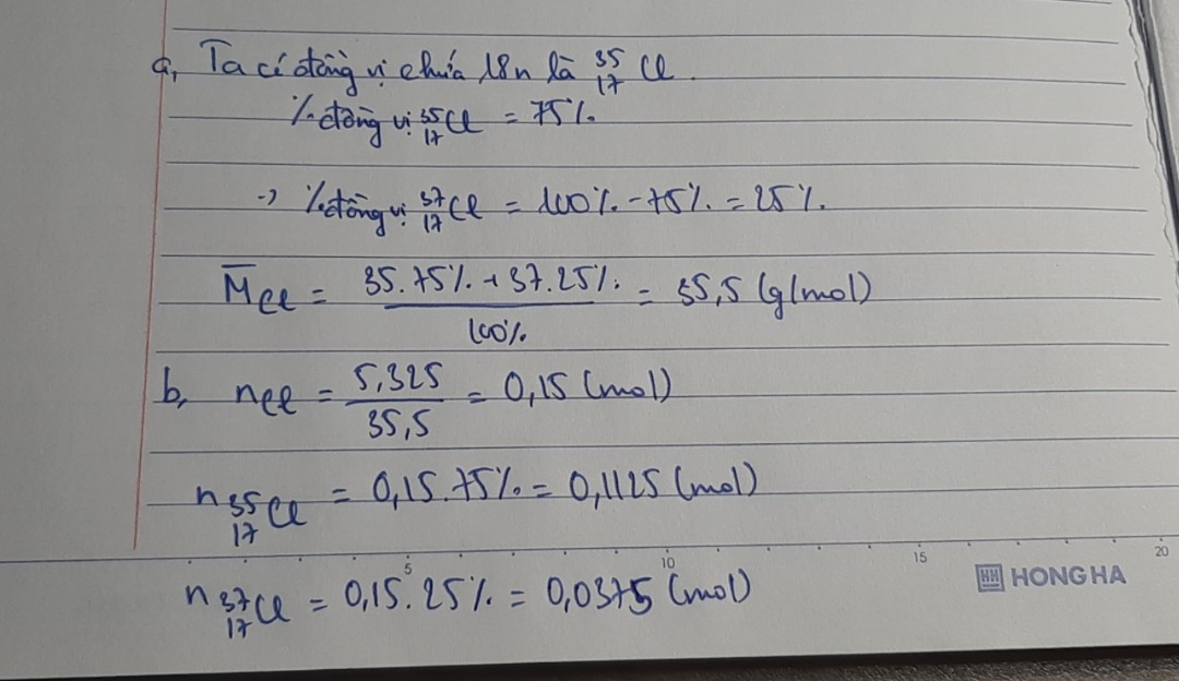 b) tính số mol mỗi loại đồng vị có trong 5,325g Chlorine