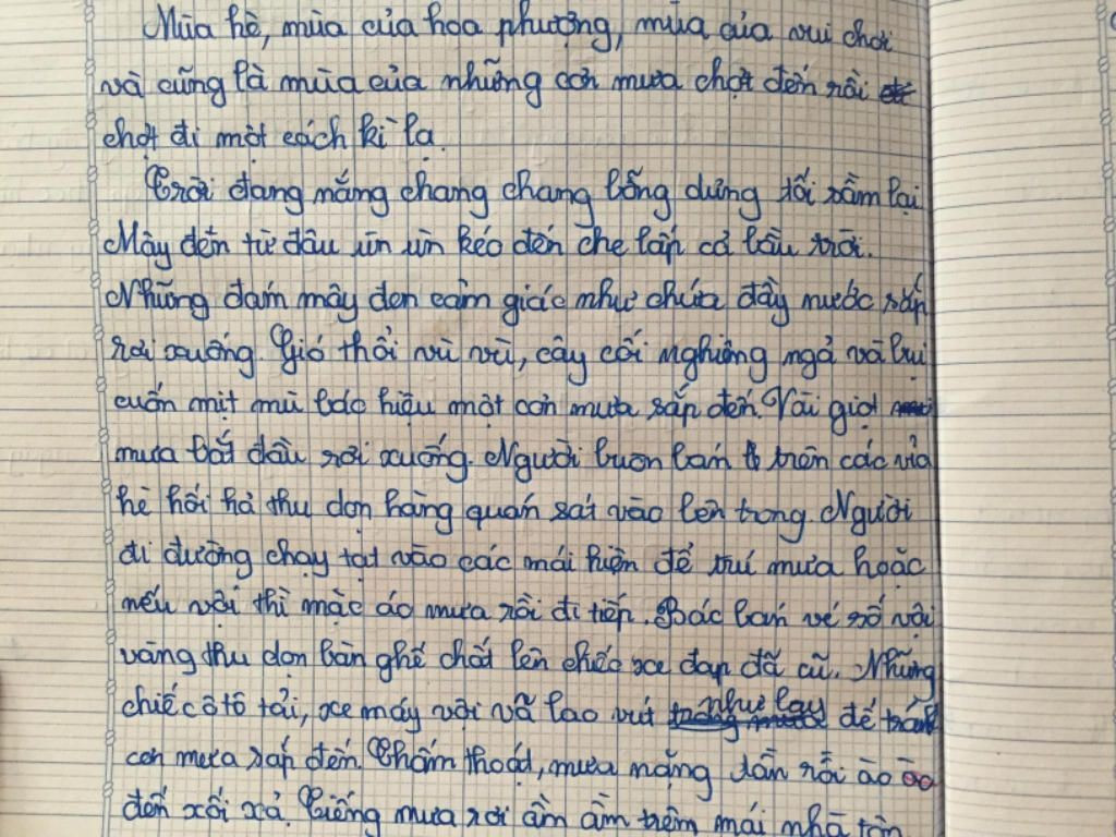 Mẹ gọi với vào trong nhà: "Hương ơi, cất quần áo đi con! Sắp mưa rồi!” Em vội vàng chạy ra sân khi những đám mây đen đang xô đẩy nhau phủ kín cả nền trời. Và cơn mưa đầu hạ ập đến, bắt đầu từ những tiếng lộp bộp mỗi lúc một dày thêm trên mái hiên trước nhà. Những cơn mưa rào mùa hạ lúc nào cũng vội vàng như thế.