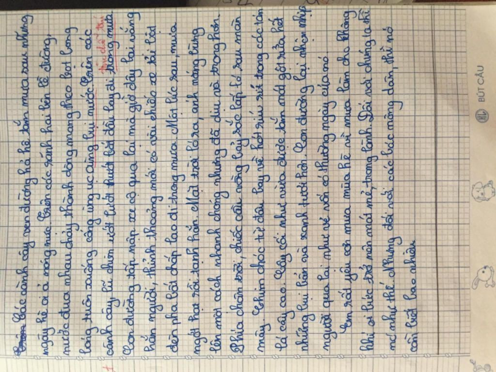 Trời đang nắng đẹp, bỗng một cơn gió mạnh nổi lên và ngay sau đó những hạt mưa xối xả trút xuống. Em vội chạy vào trú dưới mái hiên một cửa hàng bên đường. Nhiều người đi đường cũng đổ vào đứng trú mưa. Những người đi xe đạp, xe máy cũng vội dừng xe, chạy vào trú. Có người lao cả xe lên hè phố để mong tránh được cơn mưa. Có những anh thanh niên cứ phóng xe chạy tới trên đường mặc cho mưa rơi, rạp người nên tay lái mà đầu tóc ướt sũng nước. Chỉ những chiếc xe ô tô là chẳng sợ gì, cứ ung dung chạy, làm bắn tóe nước ra hai bên khi băng qua các vũng nước trên đường.