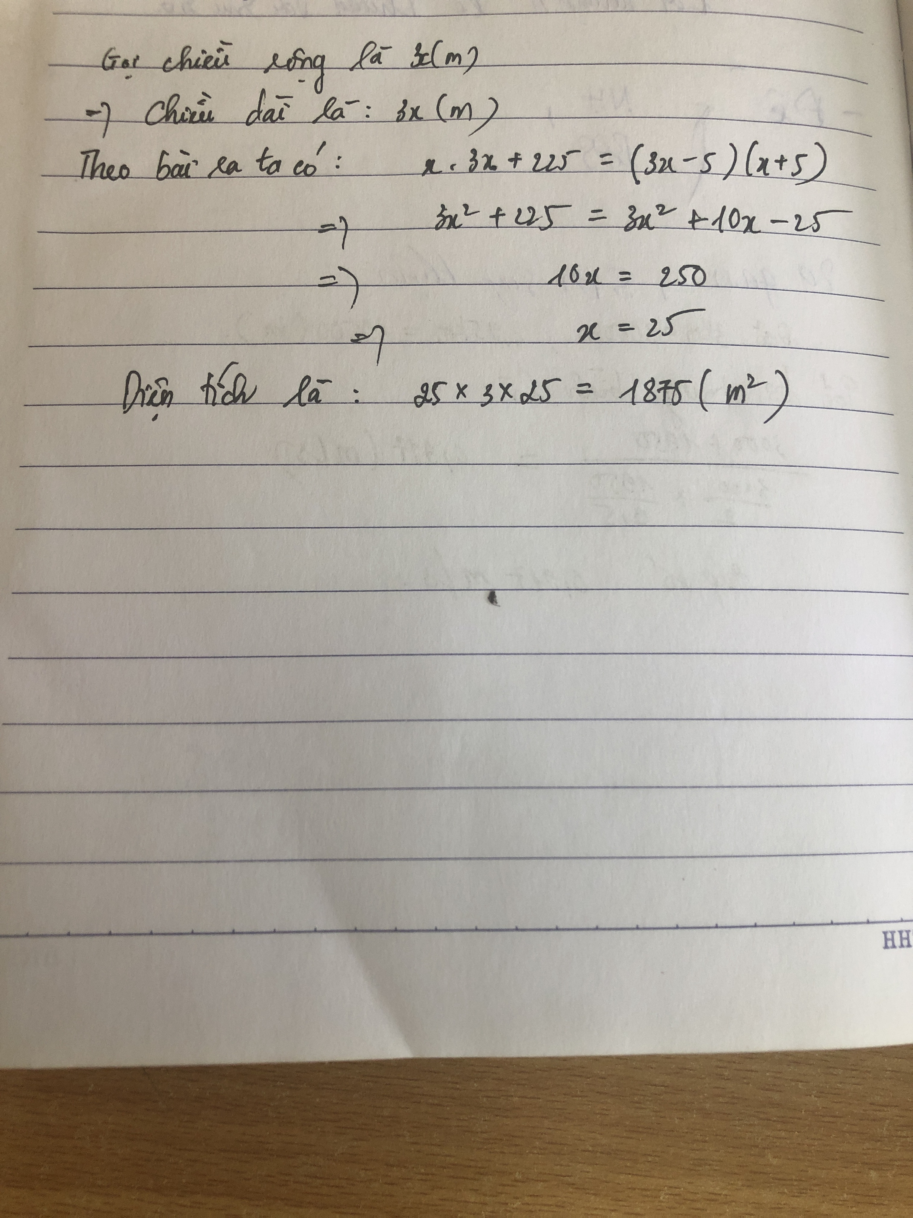 Nếu tăng chiều dài 5 cm và giảm chiều rông đi 5 cm thì diện tích giảm đi 225 cm2