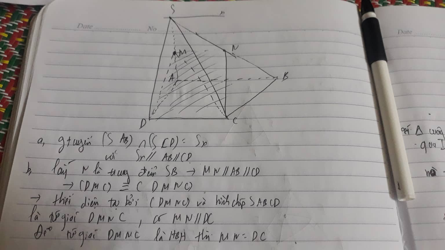 Cho hình chóp S.ABCD có đáy ABCD là hình thang, đáy lớn AB. Gọi M là trung điểm của SA a) Tìm giao tuyến của hai mặt phẳng (SAB) và (SCD) b) Xác định thiết diện của hình chóp S.ABCD khi cắt bởi mặt phẳng (MCD). Tìm điều kiện của đáy ABCD để thiết diện là hình bình hành