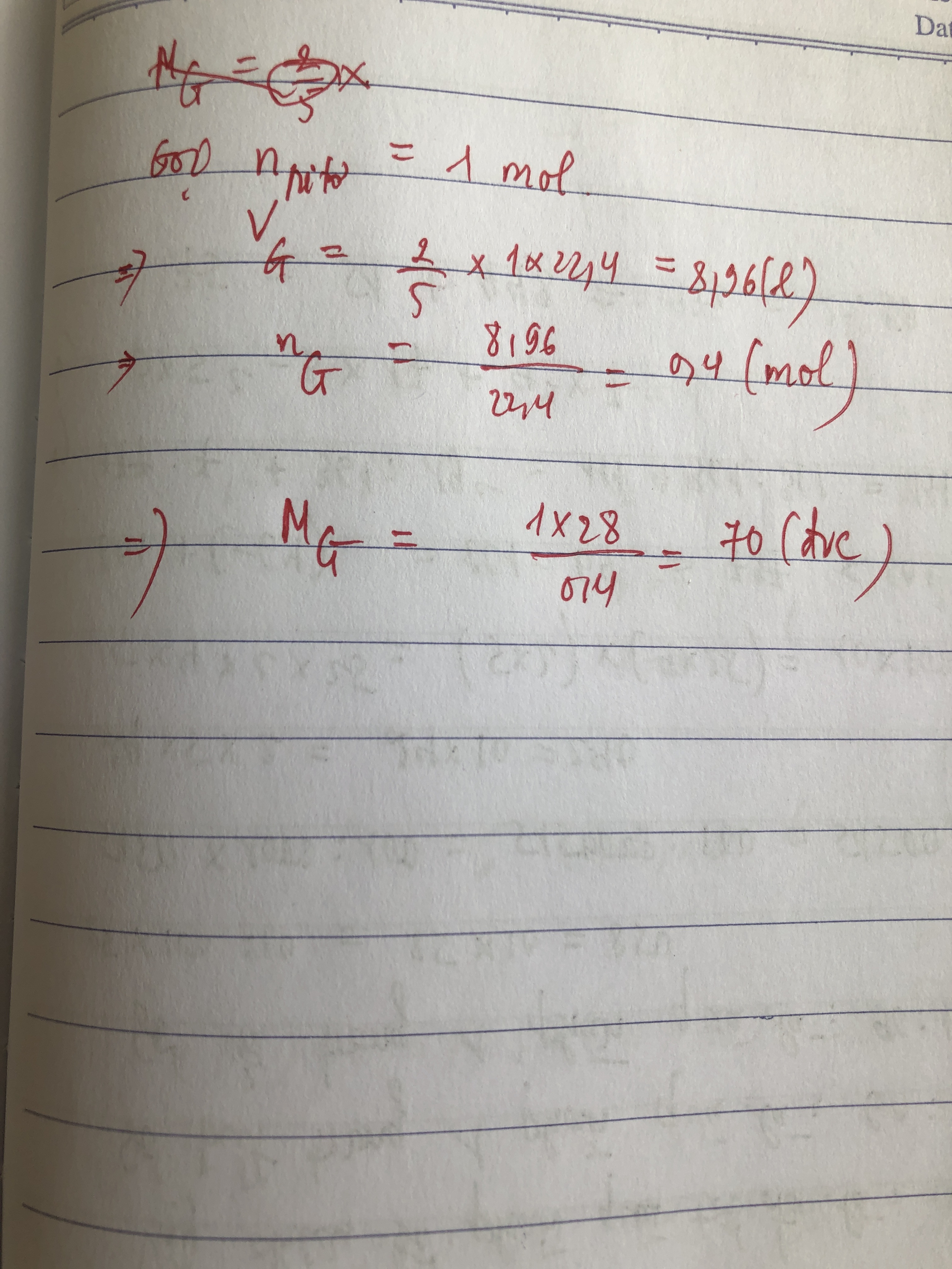Xác định khối lượng mol phân tử của các khí trong TH sau : một lượng khí G chiếm thể tích bằng 2/5 thể tích của cùng một lượng khí nitơ ( đo cùng đk )