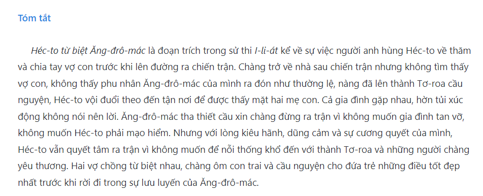 éc-to từ biệt Ăng-đrô-mác là đoạn trích trong sử thi I-li-át kể về sự việc người anh hùng Héc-to về thăm và chia tay vợ con trước khi lên đường ra chiến trận. Chàng trở về nhà sau chiến trận nhưng không tìm thấy vợ con, không thấy phu nhân Ăng-đrô-mác của mình ra đón như thường lệ, nàng đã lên thành Tơ-roa cầu nguyện, Héc-to vội đuổi theo đến tận nơi để được thấy mặt hai mẹ con. Cả gia đình gặp nhau, hờn tủi xúc động không nói nên lời. Ăng-đrô-mác tha thiết cầu xin chàng đừng ra trận vì không muốn gia đình tan vỡ, không muốn Héc-to phải mạo hiểm. Nhưng với lòng kiêu hãnh, dũng cảm và sự cương quyết của mình, Héc-to vẫn quyết tâm ra trận vì không muốn để nỗi thống khổ đến với thành Tơ-roa và những người chàng yêu thương. Hai vợ chồng từ biệt nhau, chàng ôm con trai và cầu nguyện cho đứa trẻ những điều tốt đẹp nhất trước khi rời đi trong sự lưu luyến của Ăng-đrô-mác.