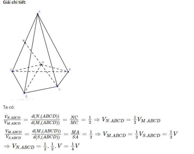 cho hình chóp SABCD có đáy là hình chữ nhật biết thể tích khói chóp đó bằng V. Gọi M,N lần lượt là trung điểm của AB, AD thể tích khối chóp S.AMCN