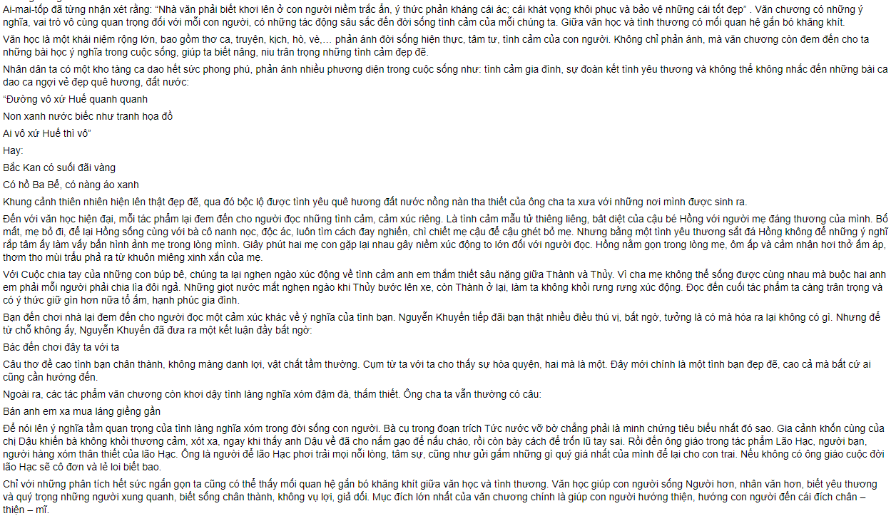 Đề ra: khi bàn về thiên chức của nhà văn Aimatop đã từng nói: nhà văn phải biết khơi lên ở con người niềm trắc ẩn, ý thức phản kháng cái ác, cái khát vọng, khôi phục và bảo vệ những cái tốt đẹp. Bằng trải nghiệm văn học lớp 8 em hãy làm sáng tỏ nhận định trên