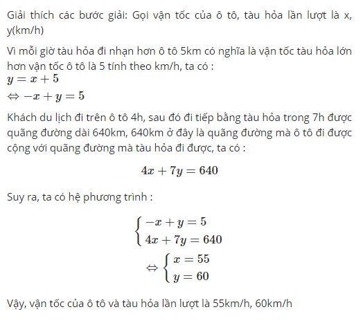 Gọi vận tốc của ô tô, tàu hỏa lần lượt là x, y(km/h)