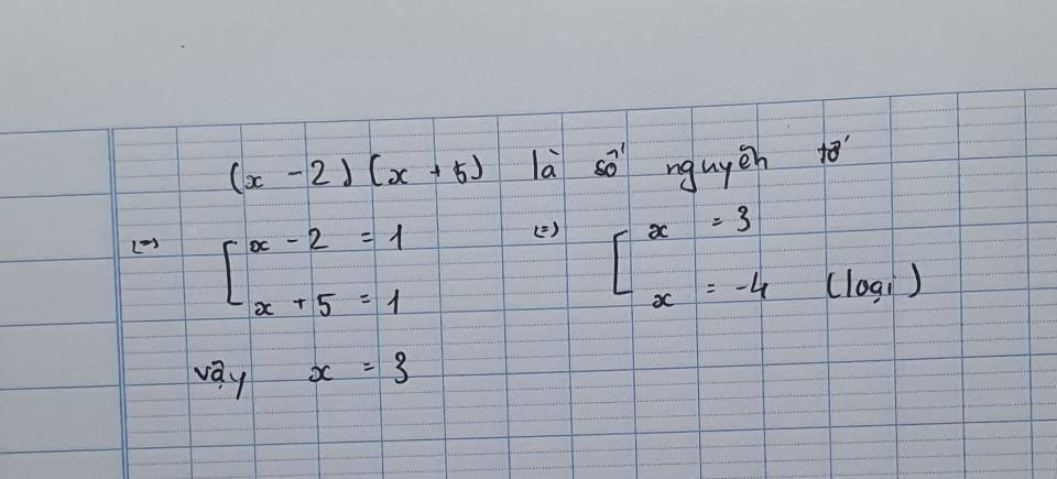 Sửa lại: xóa phần「vậy x = 3」rồi ghi như này: "tại x = 3, (x - 2)(x + 5) = 1 . 8 = 8, không là số nguyên tố vậy không tồn tại x thỏa mãn đề bài"