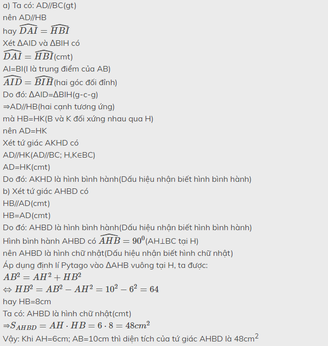 b) chứng minh tứ giác AHBD là hình chữ nhật từ đó tính diện tích của tứ giác AHBD nếu AH =6cm; AB=10cm