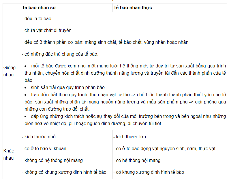 phân biệt tế bào nhân sơ với tế bào nhân thực?