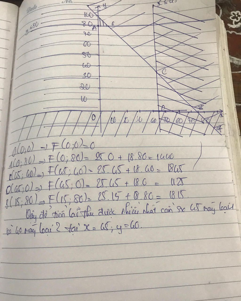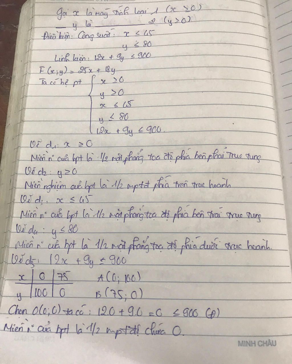 Một công ty điện tử sản suất hai loại máy tính trên hai dây tính loại một sản xuất trên dây chuyền một với công suất tối đa 45 xuất trên dây chuyền hai với công suất tối đa 80 máy tính một ngày. Để sản xuất một chiếc máy tính loại một cần 12 linh kiện và cần 2 linh kiện để sản xuất một máy tính loại hai. Biết rằng số linh kiện có thể sử dụng tối đa trong một ngày là 900 linh kiện và tiền lãi bán một chiếc máy loại một là 2.500.000 đồng; tiền lãi khi bán một chiếc máy loại hai là 1.800.000 đồng. Hỏi cần sản xuất mỗi loại bao nhiêu máy tính để tiền lãi thu được trong một ngày là nhiều nhất. (Giả thiết rằng tất cả các máy tính sản xuất ra trong ngày đều bán hết).