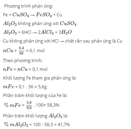 Cho 9,6g hỗn hợp Sắt và nhôm oxit tác dụng với dung dịch CuSO4 dư sau khi phản ứng kết thúc lọc lấy phần chất rắn không tan rửa sạch bằng nước sau đó cho phần chất rắn tác dụng với dung dịch HCl dư thì còn lại 6,4g chất rắn màu đỏ