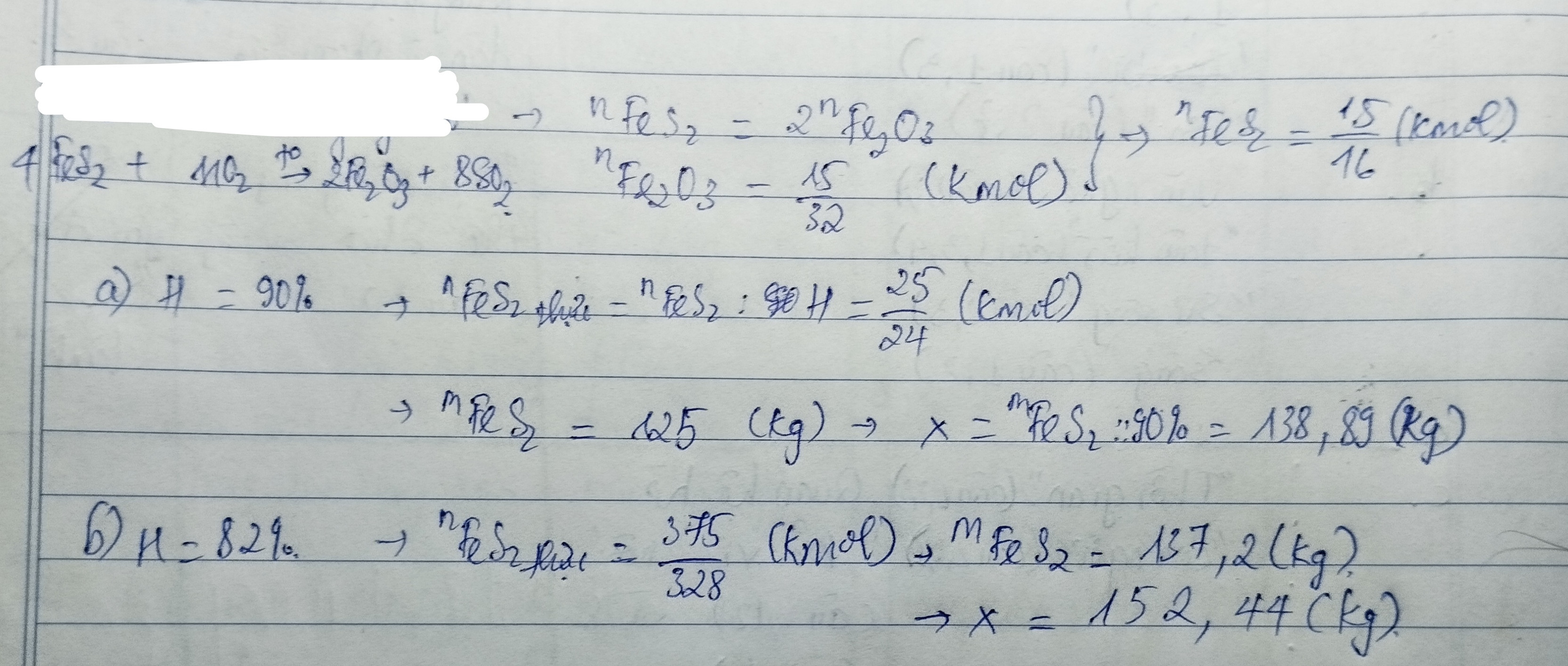Đốt x(kg) quặng pirit sắt(chứa 90% FeS2) thu được 75kg sắt (III) oxit và khí lưu huỳnh đioxit.Biết rằng các tạp chất trong quặng không cháy.Tính x,nếu hiệu suất phản ứng đạt: a)90% b)82%