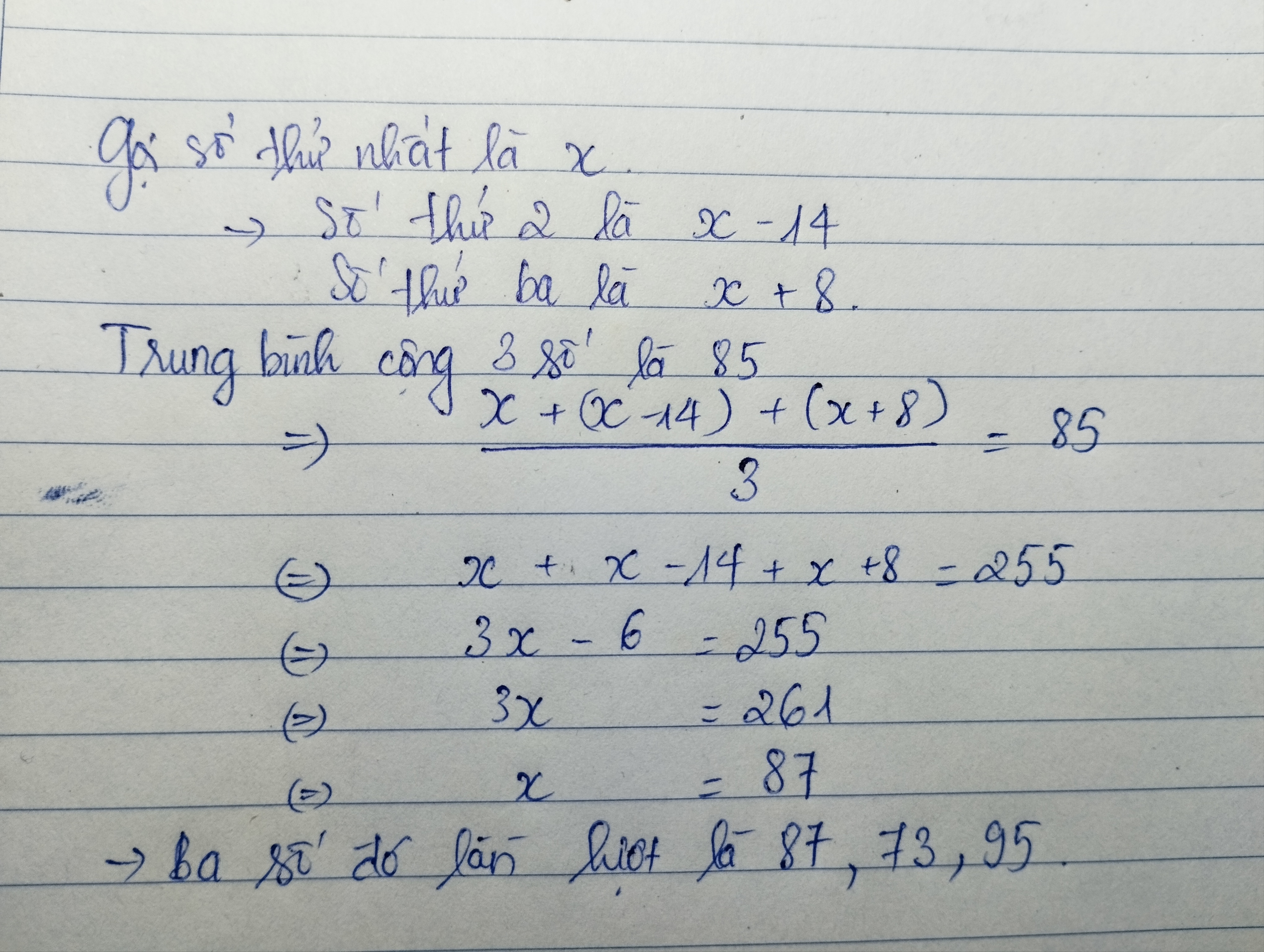 Trung bình cộng của ba số bằng 85, trong đó số thứ nhất hơn số thứ hai 14 đơn vị và kém số thứ ba 8 đơn vị. Tìm ba số đó