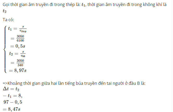 Gõ bố mạnh vào đầu a của Thanh thép có chiều dài 3.050 m Nếu người ở đầu b ghé tai xuống thanh thép thì sẽ nghe được tiếng búa gõ một lúc sau người đó lại nghe một tiếng bó hũ một lần nữa biết vận tốc truyền âm trong không khí là 341 m/s và vận tốc truyền âm trong không thép là 6.100 mét trên giây hãy giải thích tại sao ở đầu kia nghe được hai miếng gõ. khoảng thời gian giữa hai lần của tiếng múa truyền tới tai nghe ở đầu b là bao nhiêu