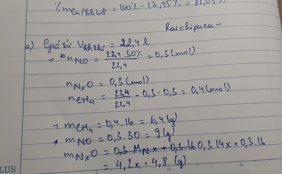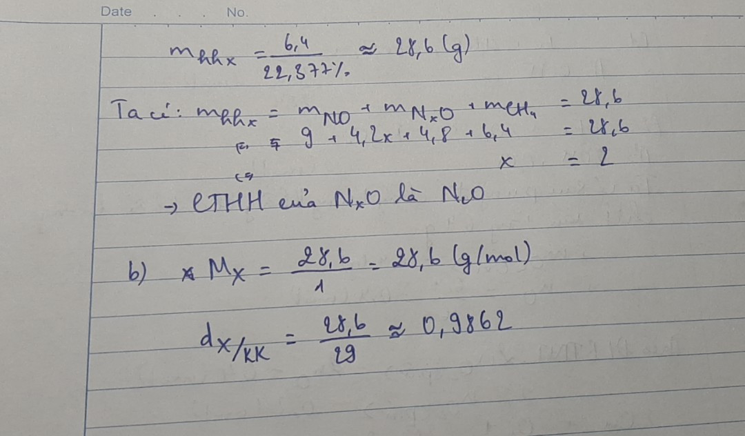 Hỗn hợp khí x gồm NO,NxO ,CH4 trong đó NO chiếm 30% thể tích, NxO chiếm 30%, còn lại là CH4 .trong hỗn hợp CH4 chiếm 22,377% về khối lượng