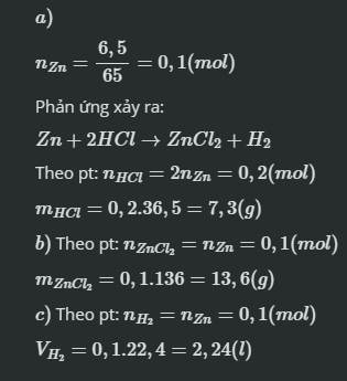 2. Cho 6,5 g Kẽm (Zn) tác dụng với dung dịch axit clo hiđric (HCl) tạo ra muối kẽm clorua (ZnCl2) và khí hiđro (H2).