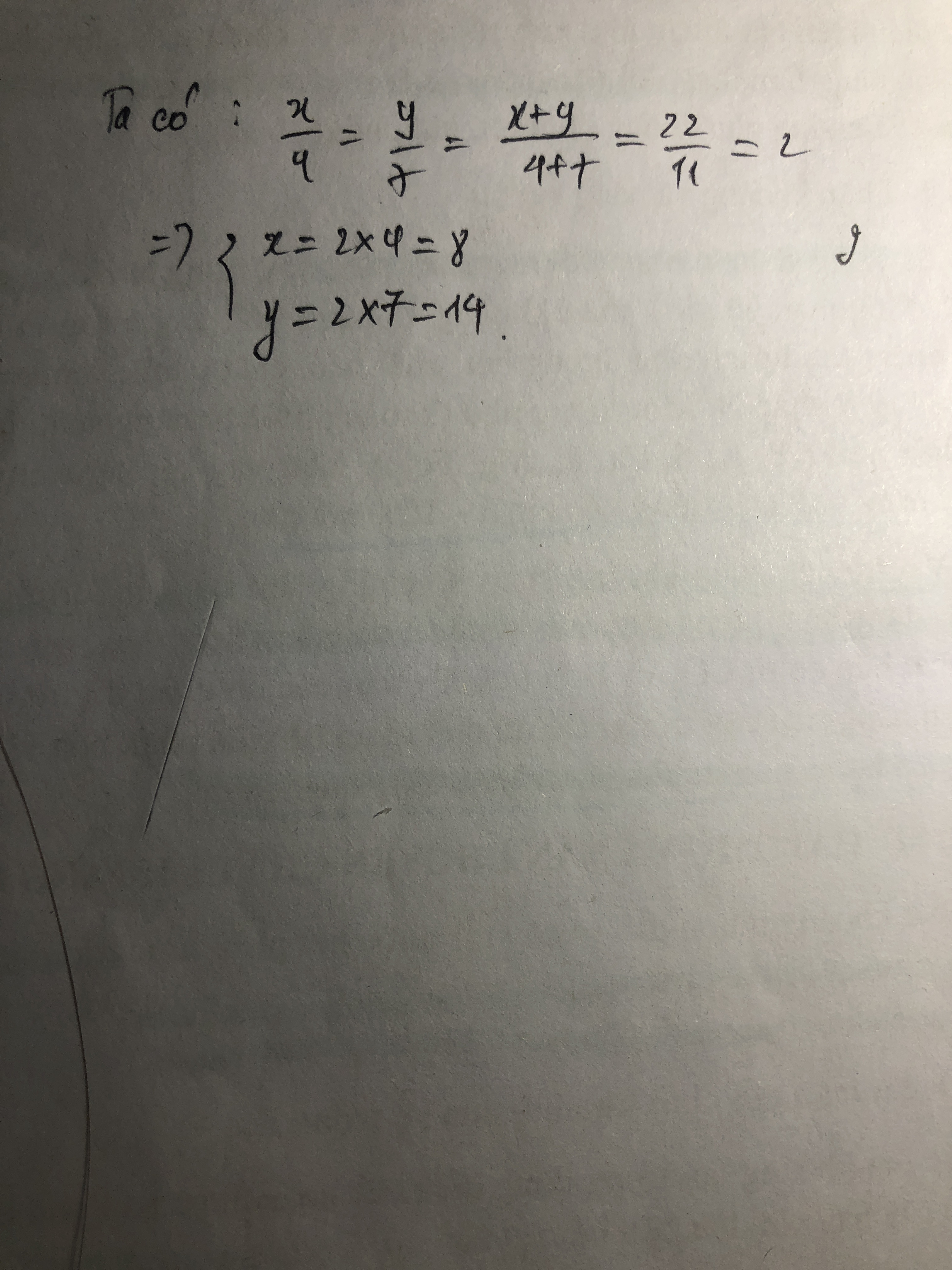 cho tỉ lệ thức x/4 = y/7 và x+y = 22 tìm x và y