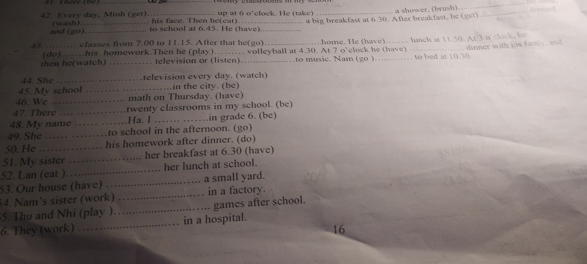 Everyday, Ninh (get)........... up at 6 o' clock .he (teke)........a shower