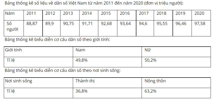Bảng thống kê số liệu về dân số Việt Nam từ năm 2011 đến năm 2020 (đơn vị triệu người):