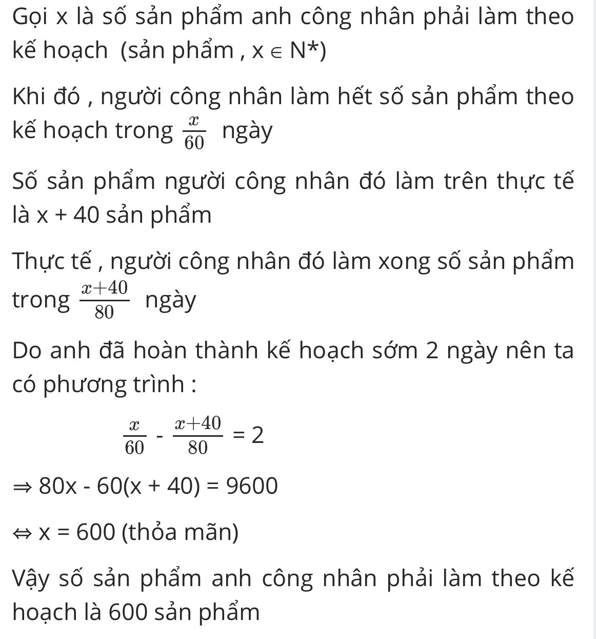 Một tổ dự định mỗi ngày làm được 60 sản phẩm do cải cải tiến kỹ thuật nên mỗi ngày tổ đó đã làm được 80 sản phẩm vì vậy không những làm xong sớm hơn 5 ngày mà còn vượt mức 100 sản phẩm tính số sản phẩm được giao