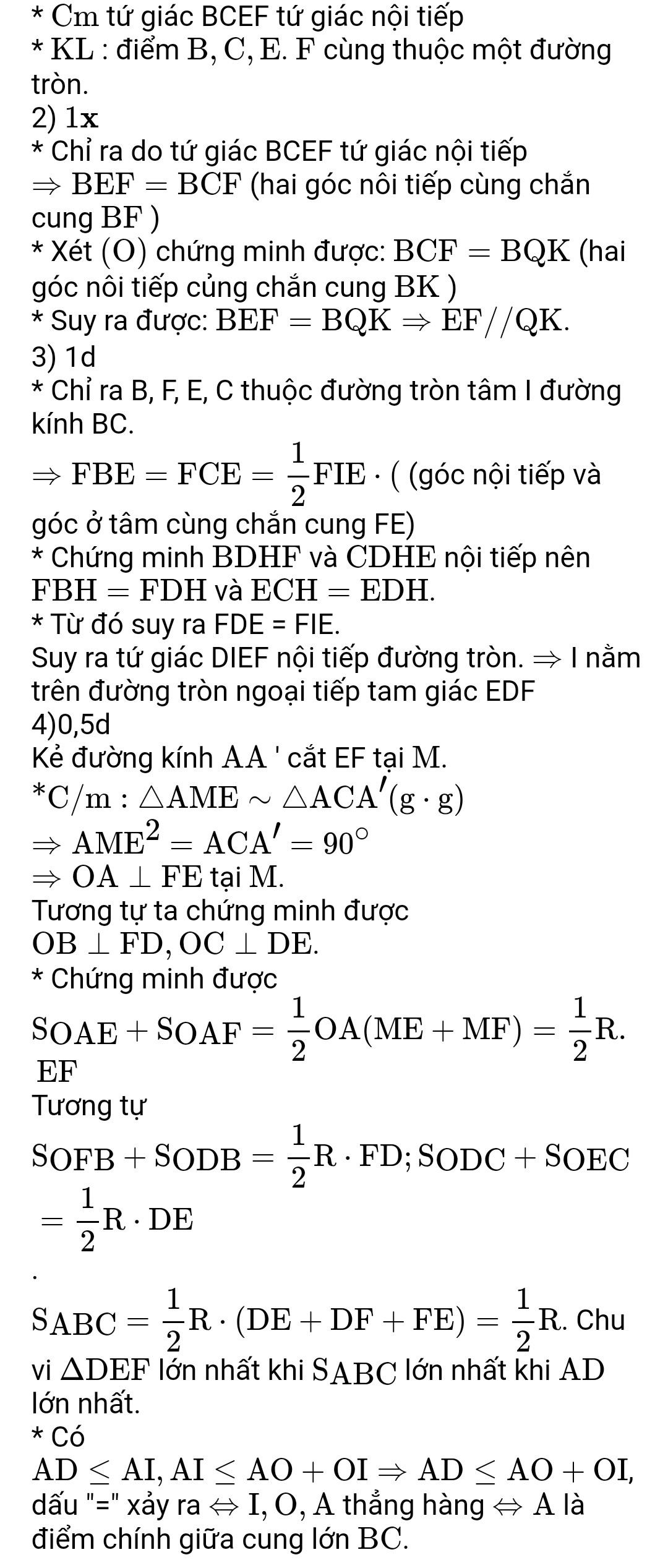 Cho ∆ABC nhọn nội tiếp (O,R). Các đường cao AD,BE,CF cắt nhay tại H. Các đường thẳng BE và CF cắt đường tròn (O,R) tại Q và K