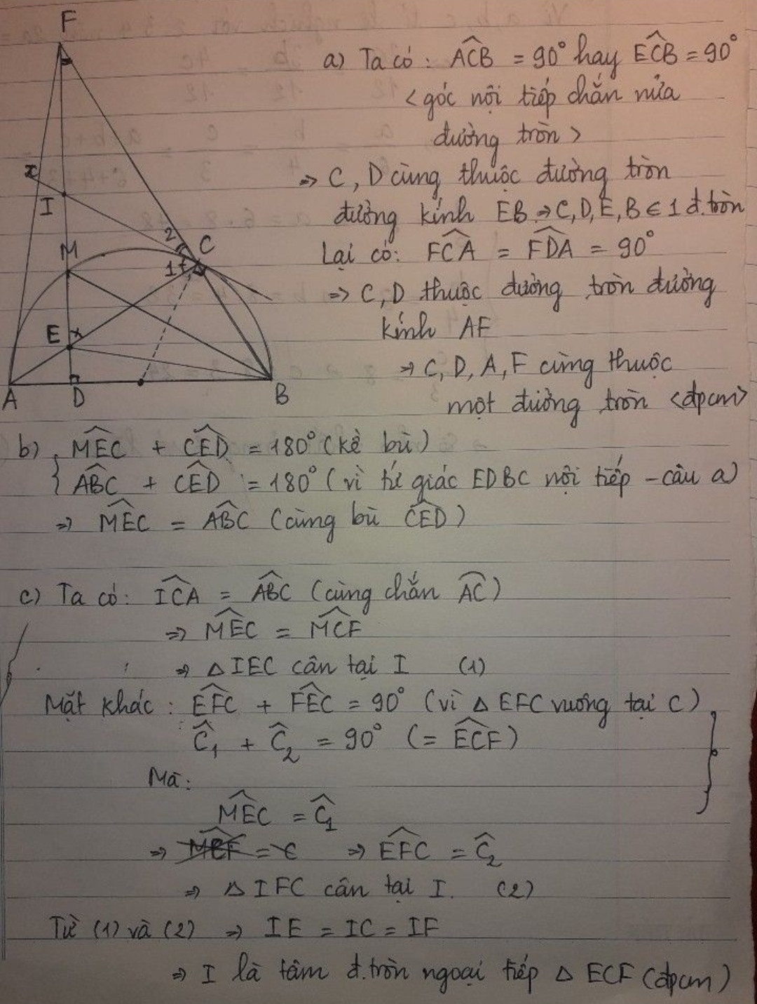 Cho nửa đường tròn tâm Ở, đường kính AB. M là điểm bất kì trên cung AB. Kẻ MD vuông góc với AB. Qua C trên cung MB, kẻ tiếp tuyến Cx cắt DM tại I. DM cắt AC tại E và cắt BC kéo dài ở F. Chứng minh rằng:
