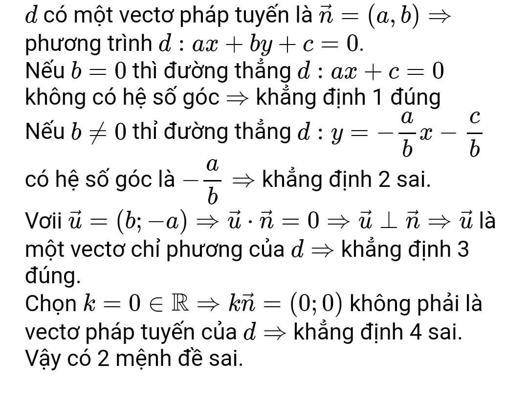 Cho đường thẳng d có 1 vectơ pháp tuyến là n=(a;b), a, b thuộc R. Xét các khẳng định sau: