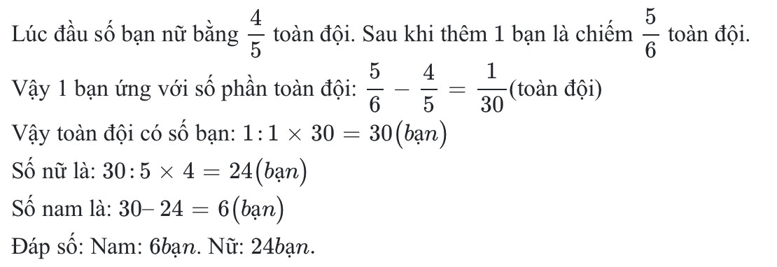 Lúc đầu số bạn nữ bằng `4/5` toàn đội. Sau khi thêm `1` bạn là chiếm `5/6` toàn đội.