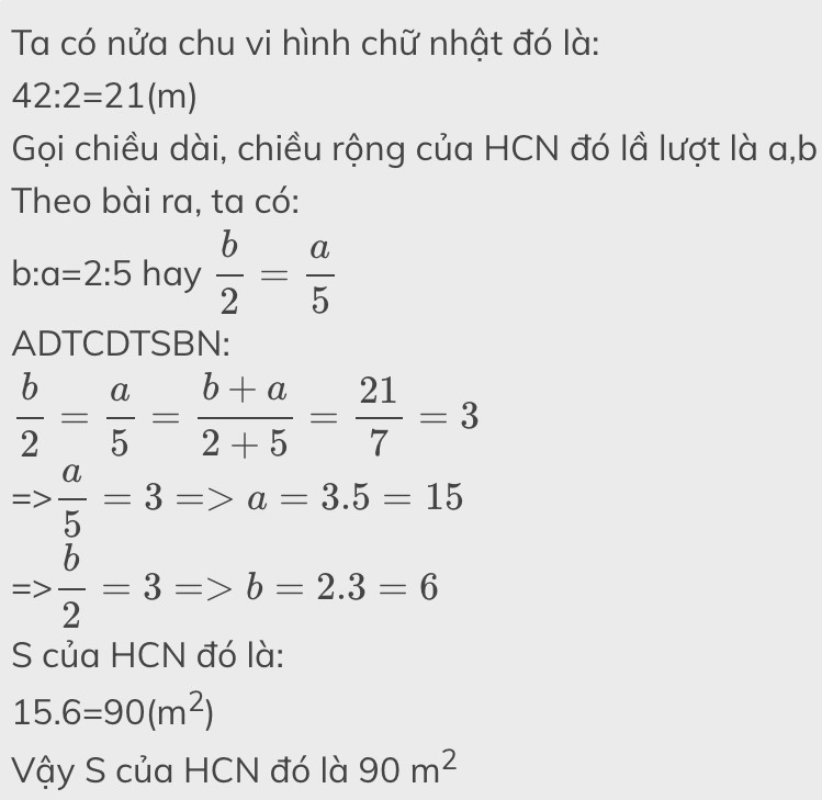Tỉ số cạnh của hình chữ nhật bằng 2 phần5 chu vi hình chữ nhật là 42m . TÍNH DIỆN TÍCH CỦA Hình chữ nhật