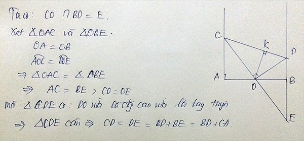 Cho O là trung điểm của đoạn thẳng AB.Trên cùng nửa mặt phảng bờ là đường thẳng AB,vẽ hai tia Ax và By vuông góc với AB.Gọi C là một điểm bất kì thuộc tia Ax.Đường thẳng vuông góc với OC tại O cắt tia By ở D,tia CO cắt đường thằng By ở K,chứng minh rằng: