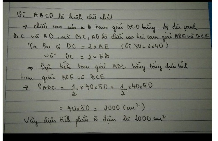 Cho hình chữ nhật ABCD có kích thước như hình vẽ sau. Tính diện tích phần gạch chéo có trong hình chữ nhật.