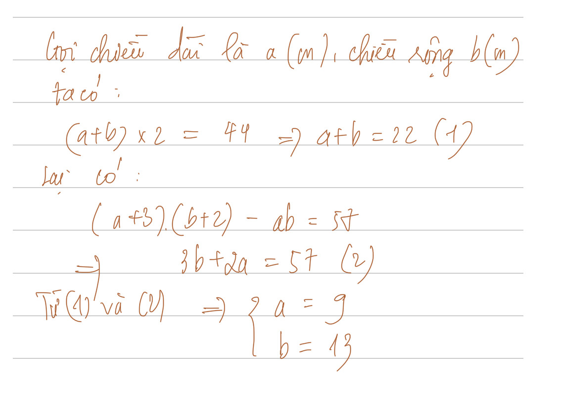 Một mảnh vườn hcn có chu vi 44m. Nếu tăng chiều dài thêm 3m và chiều rộng 2m thì diện tích tăng thêm 57m vuông. Tính chiều dài và chiều rộng của mảnh vườn đã cho.