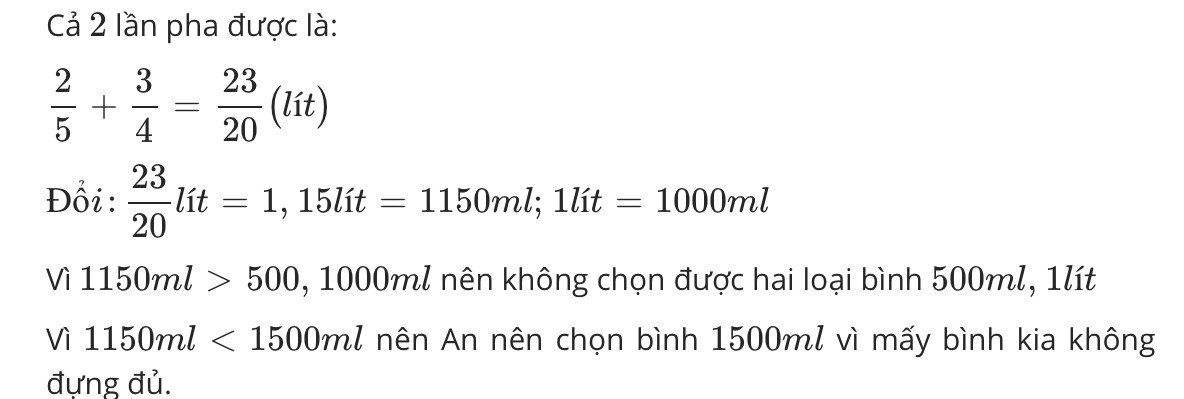 Pha nước chanh để chuẩn bị cho bố mẹ đi làm về uống lần thứ nhất Lan pha được 2/5 một lít nước chanh lần thứ hai lan pha được 3/4 lít nước chanh sau hai lần pha lan đổ nước chanh vào chung một bình đựng nước trong nhà có 3 loại bình nước Bình 500 ml Bình 1 l và bình 1500 ml nếu chỉ chọn một bình để đựng nước chanh An nên chọn bình nào vì sao