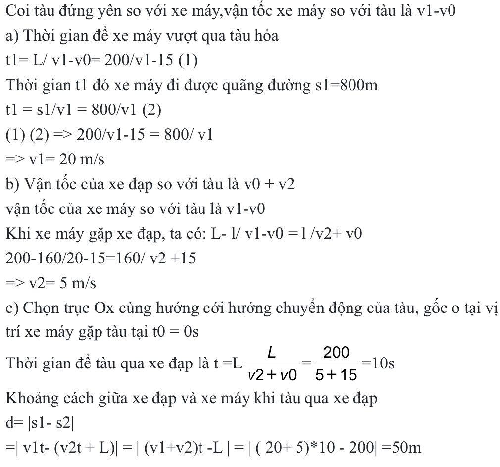a) Xe máy bắt đầu vượt qua tàu khi xe máy đã đi được quãng đường s1 = 800m kể từ thời điểm to = 0 (s). Tính tốc độ v1 của xe máy.