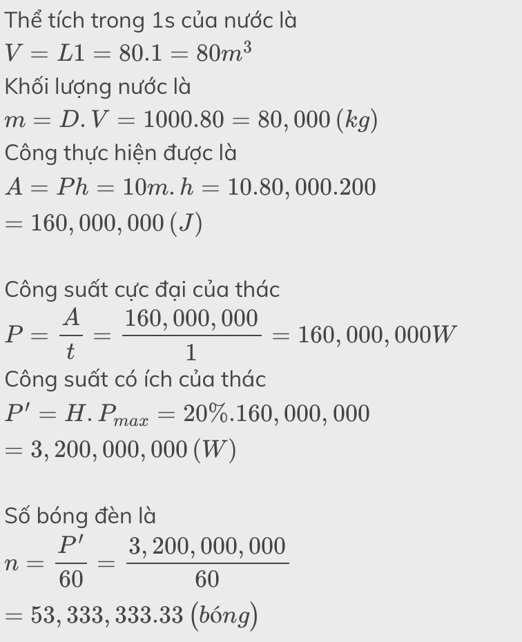 Một thác nước cao 200m có lưu lượng 80m^3/phút, khối lượng riêng của nước là 1000kg/m^3. Tính công suất cực đại mà ta có thể khai thác được của thác nước. Giả sử máy phát điện sử dụng 30% công suất của thác, thì cùng một lúc máy phát điện có thể thắp sáng bình thường tối đa bao nhiêu bóng điện 80W?