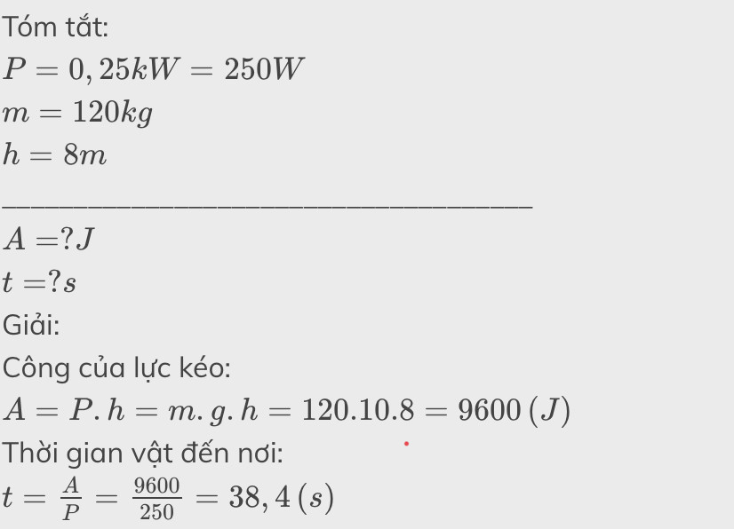 một người dùng động cơ có công suất 0,25kw để đưa một vật nặng 120kg lên độ cao 8m.tính công và thời gian vật lên tới nơi .