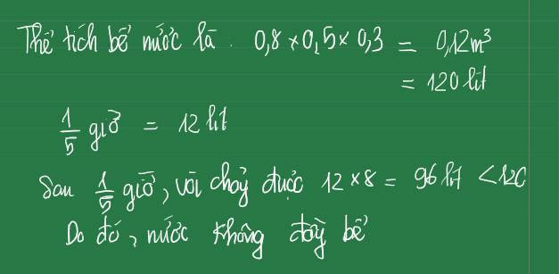Một bể không có nước dạng hình hộp chữ nhật có chiều dài 0,8 m chiều rộng 0,5 m và chiều cao 0,3 m ( độ dày bể không đáng kể) người ta mở một vòi nước chảy vào bể cứ mỗi phút chảy nước vào được 8l nước hỏi sau 1/5 giờ nước có đầy bể không?Vì sao?